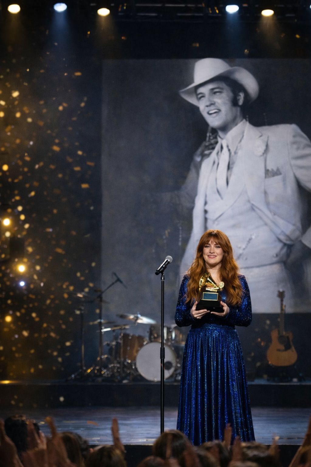 When Riley Keough’s name was announced, the room was already alive with anticipation. Applause rose before she ever reached the stage, as though the audience instinctively understood that what they were about to witness went far beyond the presentation of an award. In her hands, moments later, rested a golden GRAMMY for “Best Vocal Performance,” accepted on behalf of her grandfather, Elvis Presley, for a newly uncovered recording titled Shattered Sky. The song, long hidden from public knowledge, had found its voice decades after it was first conceived, reminding listeners that true artistry does not fade with time.