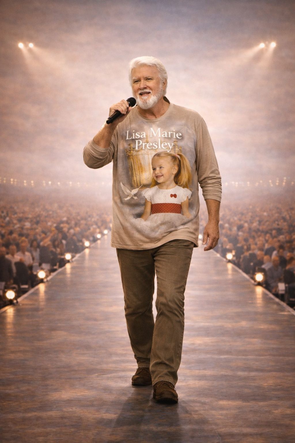 The show unfolded late at night, beneath softened lights and an atmosphere heavy with expectation. Nothing in the program hinted at what the audience was about to witness. Bob Joyce stepped onto the stage wearing a shirt bearing the image of Lisa Marie Presley, and the room shifted instantly. Conversations fell silent. Even seasoned concertgoers sensed that this moment carried a different gravity.