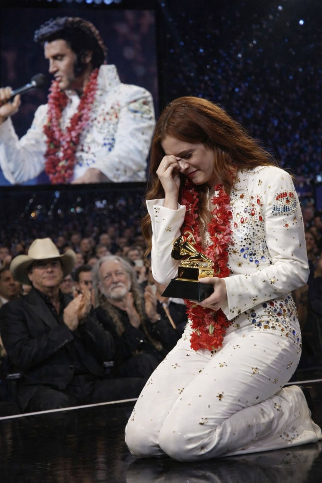 Keough’s hands trembled as she lifted the golden gramophone. The gesture was simple, but its weight was unmistakable. This was not merely a trophy being raised; it was a bridge being built—between generations, between memory and presence, between what had been lost and what still lingered in the collective imagination. The name unspoken but universally understood hovered over the room: Elvis Presley, her grandfather, and one of the most enduring figures in modern music history.
