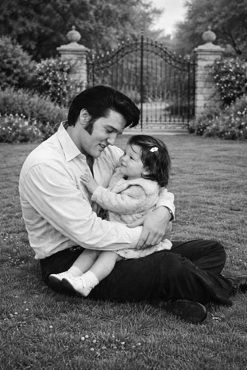 When the film ended, they returned to Graceland. At the gates, a photograph was taken—one that would later be recognized as the final known image of Elvis and his daughter together. They stand side by side, calm and unguarded, unaware of how little time remained. The picture captures no performance, no persona. It captures connection.
